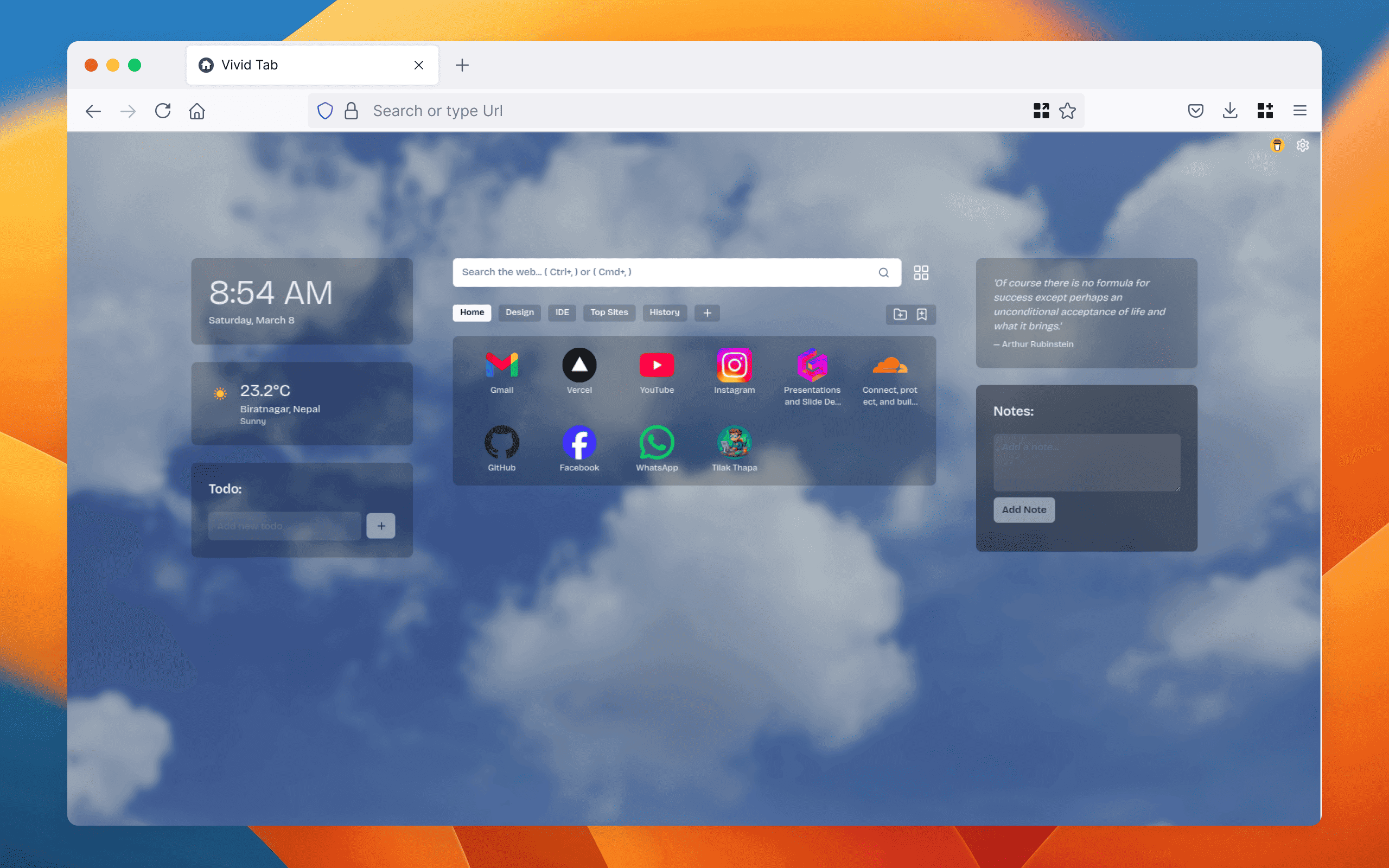 Transform your new tab into a vibrant, productive space. Vivid Tab lets you personalize your browsing experience with bookmarks, weather updates, to-do lists, and more — all in one clean, customizable dashboard.